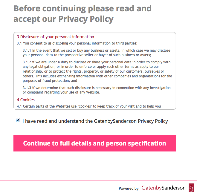 I imagine this “sharing of personal data in a way that is secure and trusted” must include “using very long privacy policies that most people will not read but are obliged to agree to before allowing people to see the important information they’ve come to a page to visit”, given that you need to accept the rather long and small print privacy policy before you can even see the person specification and full job details.